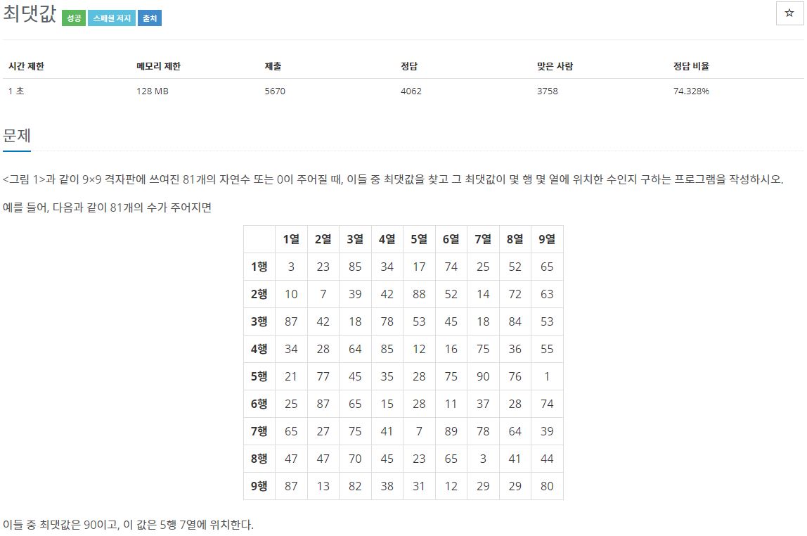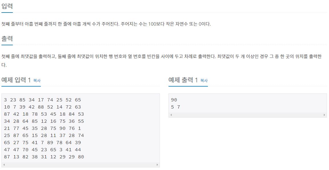 java로 풀었다면 아마도 이중 for문을 이용해서 2차원 배열을 선언하고 값을 넣어 max값을 구했을 것이다.