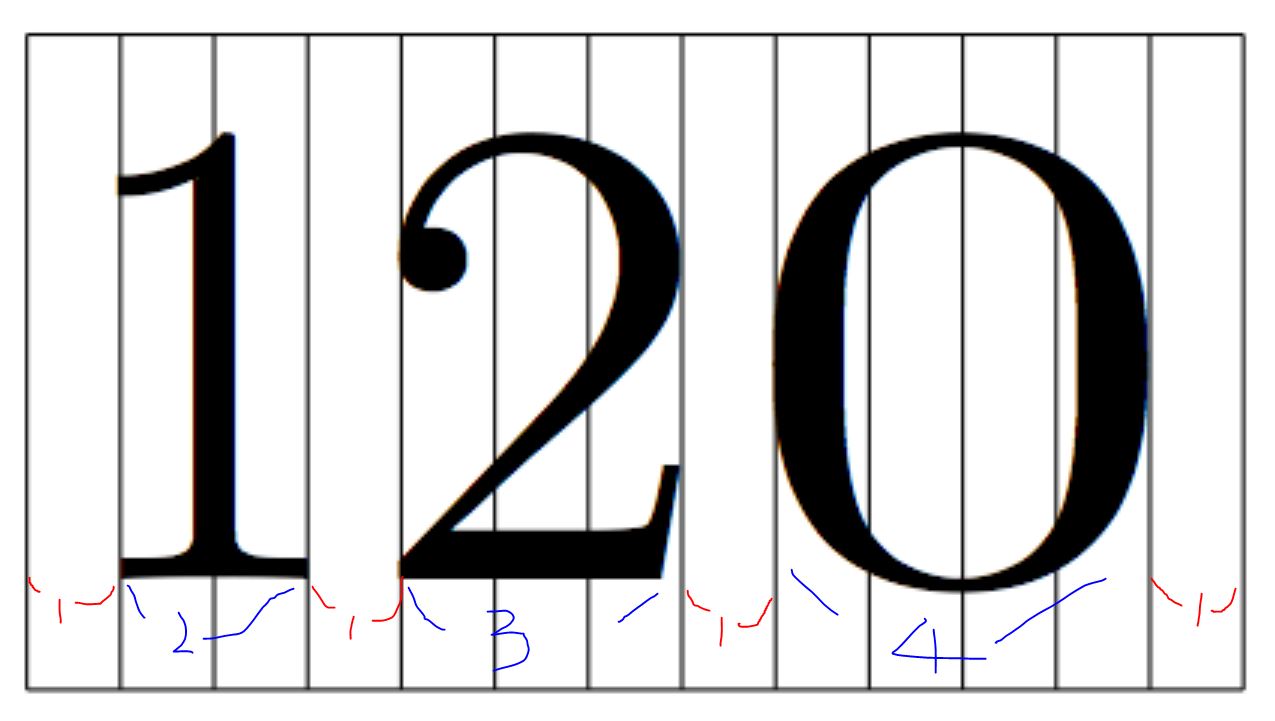 좌, 우 여백의 길이를 총 2로 생각하고, 120이라는 수이지만 쪼개면 1 2 0 이 되어 여백의 길이는 2가 되고 숫자 하나하나 차지하고 있는 길이를 구하면 1은 2, 2는 3, 0은 4가 나와서