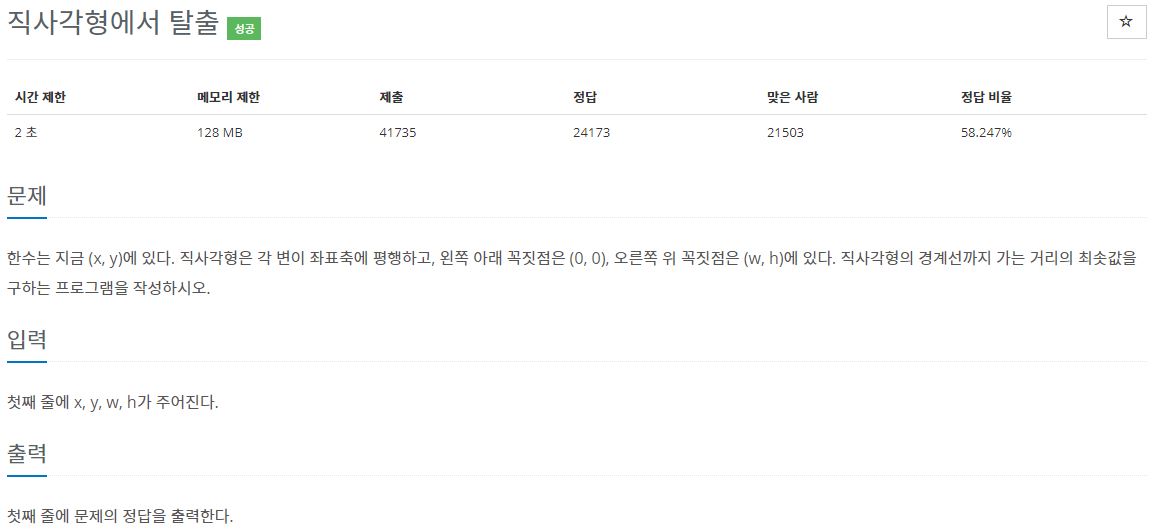 상하좌우의 최솟값 중에 가장 작은 값이 직사각형의 경계선까지 가는 거리의 최솟값이라고 볼 수 있다.