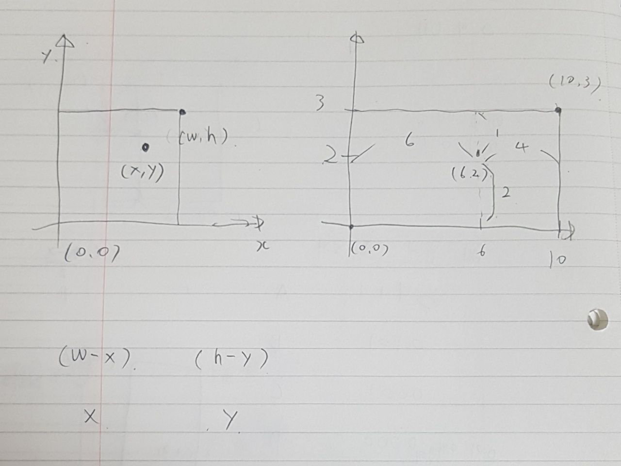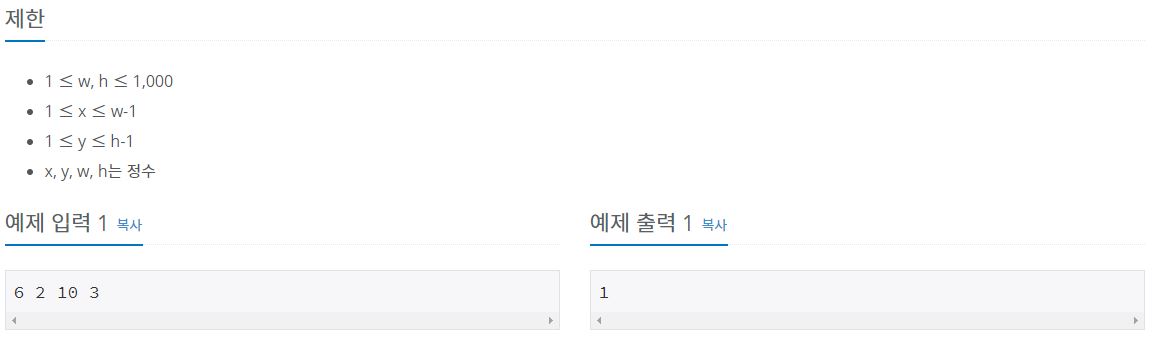 직사각형의 좌표 값이 0, 0과 w, h가 주어지는데 예제 입력 1을 예로 들면