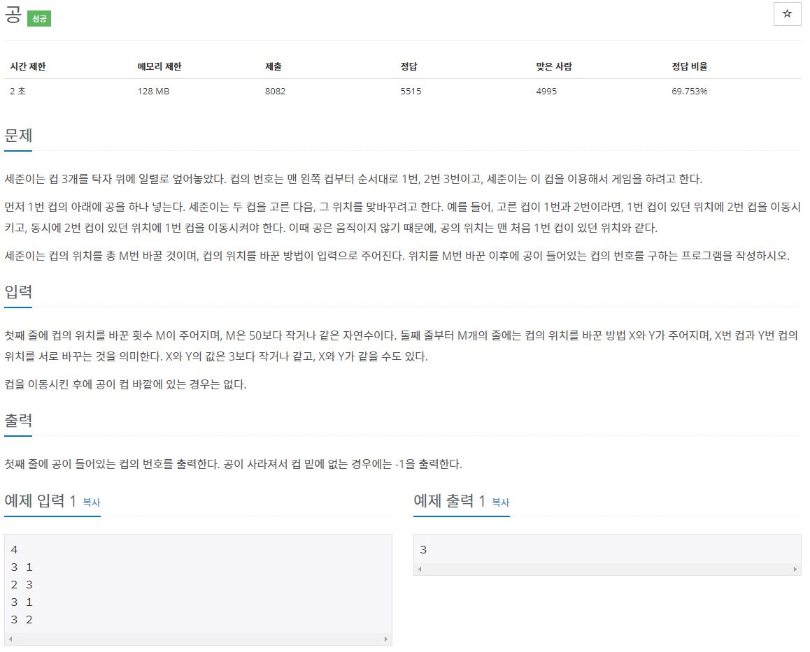map으로 여러 개의 입력을 받도록 처리하고 공의 위치를 swap을 하도록 하였다.