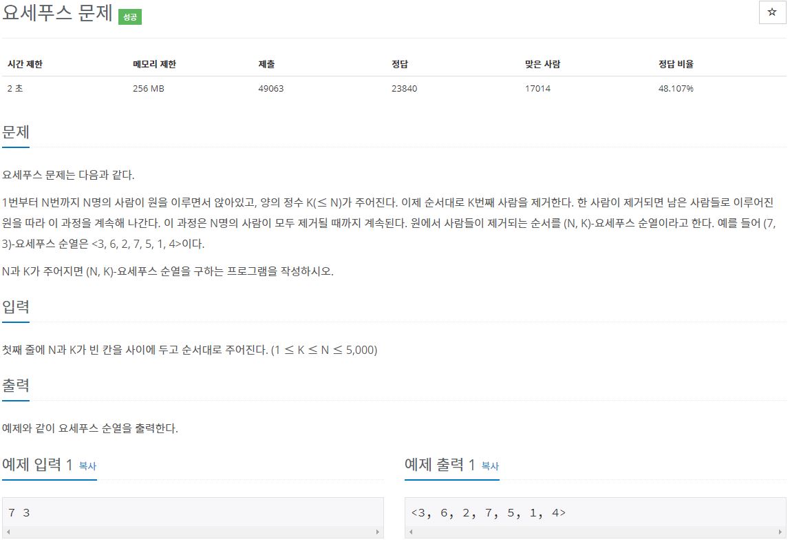 입력이 7 3일 때 (1 2 3 4 5 6 7) 번까지 총 7명의 사람이 원을 이루고 있게 되고 3번째 사람을 제거하게 되는데 표로 보여주겠다.