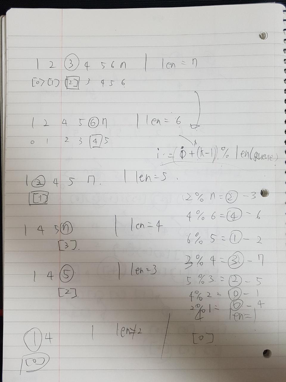 그래서 생각해본 식이 i = (i + (k-1)) % len(queue) 이다.