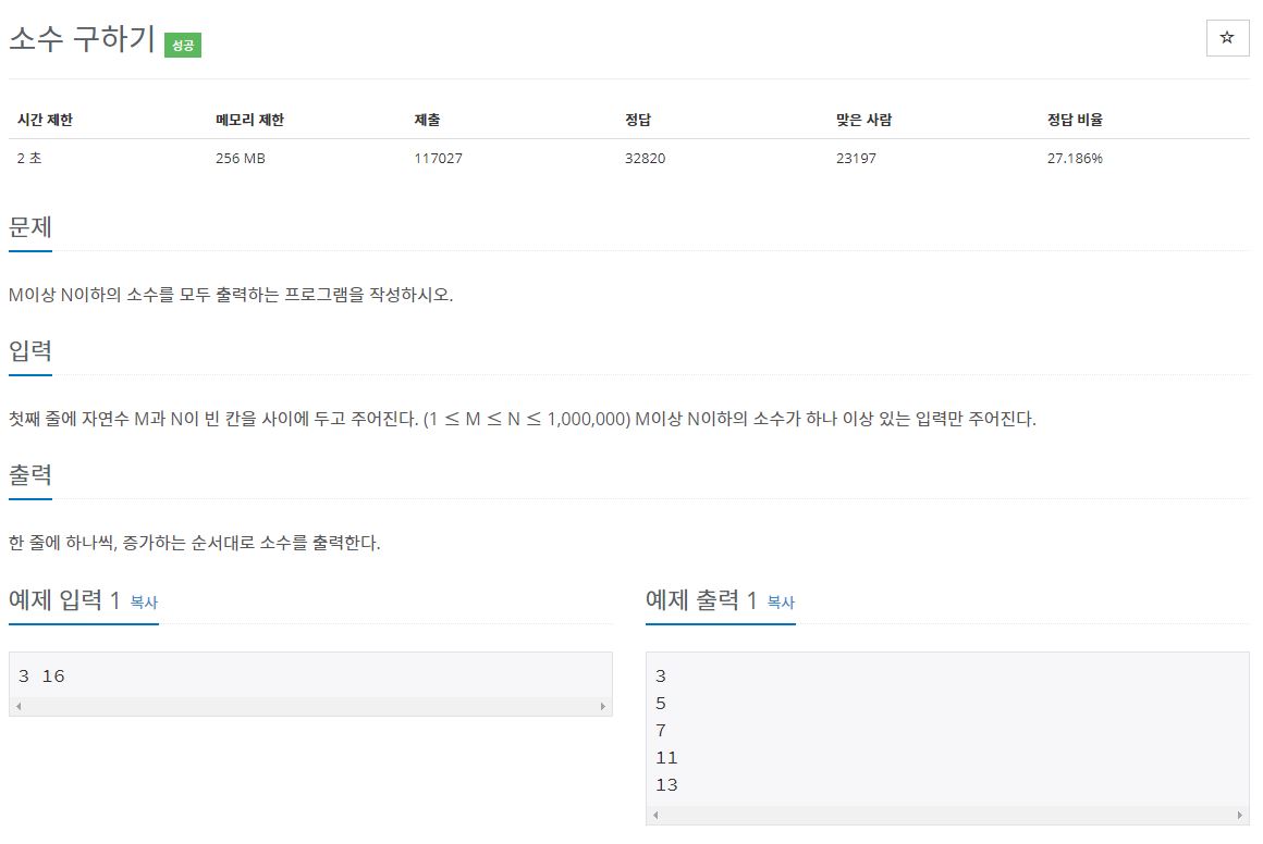 일단 M과 N의 제한은 (1 ≤ M ≤ N ≤ 1,000,000) 이기 때문에 1부터 1,000,000까지의 소수를 미리 구해놓고 M과 N사이의 소수를 반환시켜줄 것이다. N의 배수를 제거해야 되기 때문에 bool타입의 b배열을 생성해주고 소수는 2부터 시작하기 때문에 0, 1 부분을 False로 초기화해준다. 또한 소수를 저장해야 하기 때문에 배열 sosu를 생성해준다.