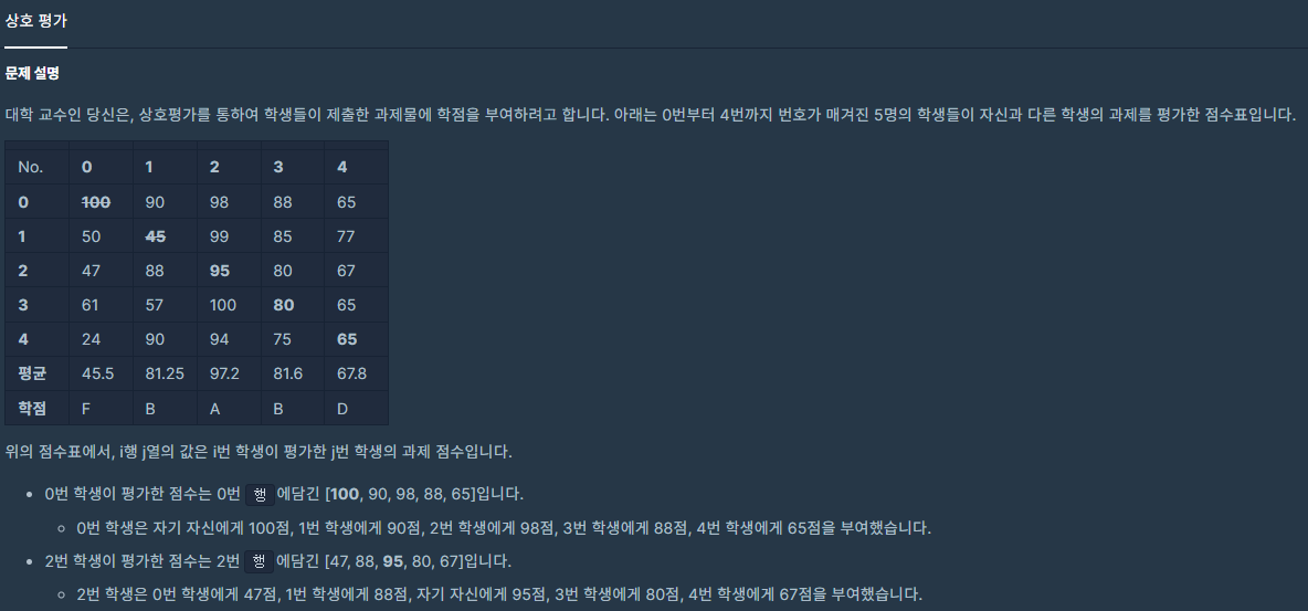 여담... 문제 끝까지 안 보고 행 X 열을 바꿔서 생각하기 전에 왜 평균이 저렇게 나오고 학점이 저렇게 부여되는지 조차 이해가 되지 않았다... 맨날 알고리즘 풀 때마다 문제 끝까지 안 보고 풀어서 항상 런타임 에러나 틀렸습니다.. 가 나오는데... 학습능력이 없는 건지... ㅋㅋㅋ 맨날 다시 보게 된다.