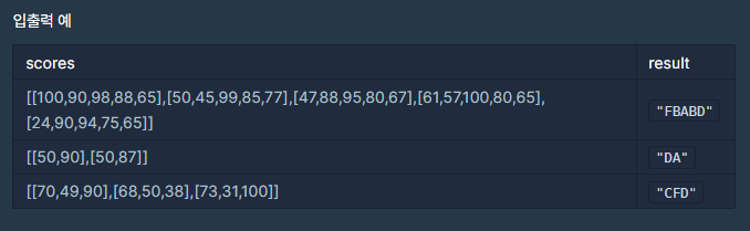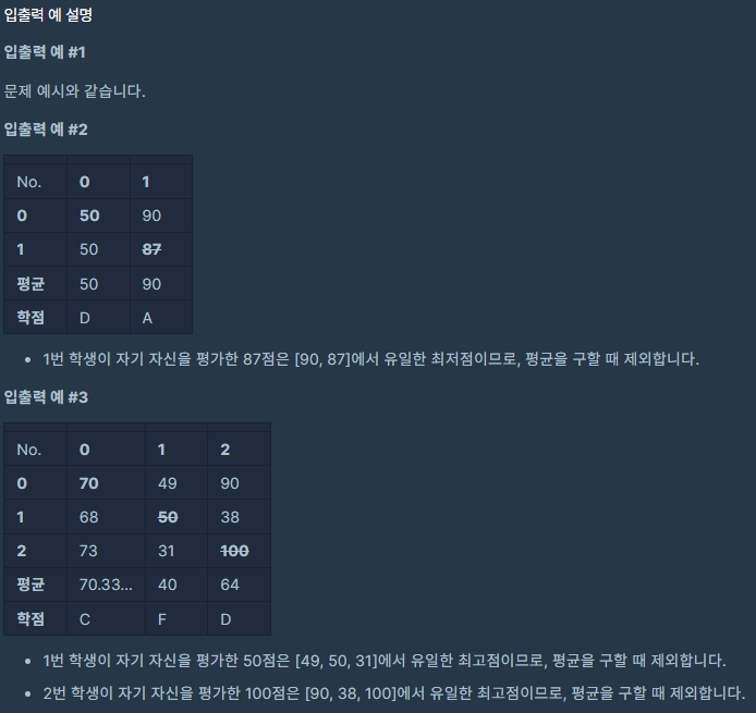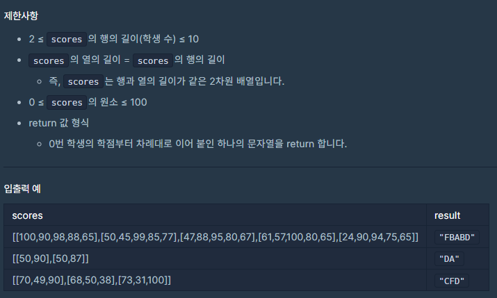 위의 메서드와 입출력 예를 보면 2차원 배열의 scores가 인자로 들어가 있다.