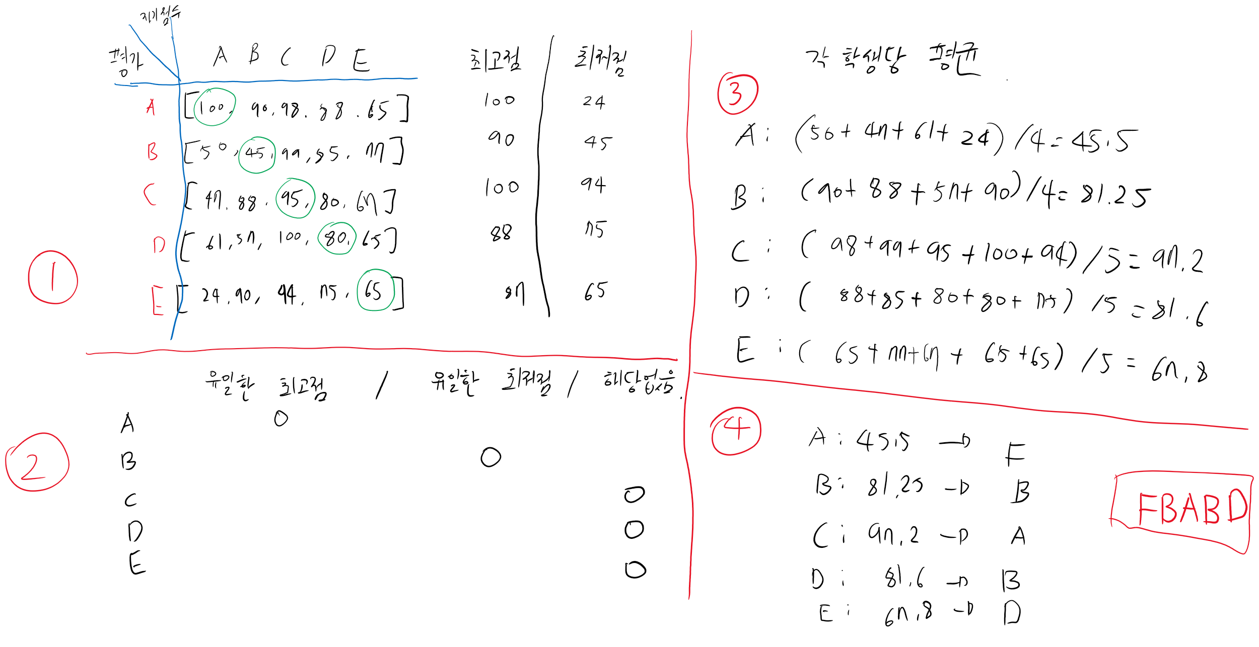 [[100, 90, 98, 88, 65], [50, 45, 99, 85, 77], [47, 88, 95, 80, 67], [61, 57, 100, 80, 65], [24, 90, 94, 75, 65]]))