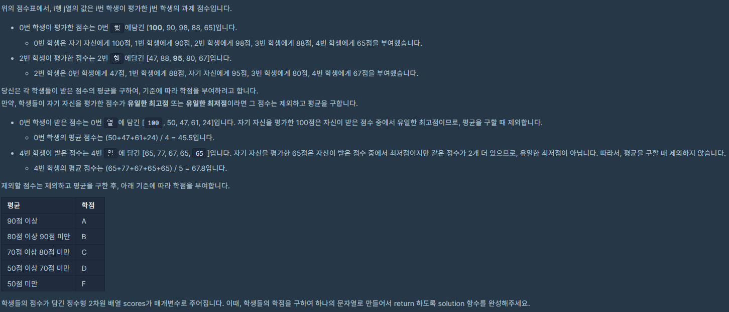 여담... 문제 끝까지 안 보고 행 X 열을 바꿔서 생각하기 전에 왜 평균이 저렇게 나오고 학점이 저렇게 부여되는지 조차 이해가 되지 않았다... 맨날 알고리즘 풀 때마다 문제 끝까지 안 보고 풀어서 항상 런타임 에러나 틀렸습니다.. 가 나오는데... 학습능력이 없는 건지... ㅋㅋㅋ 맨날 다시 보게 된다.