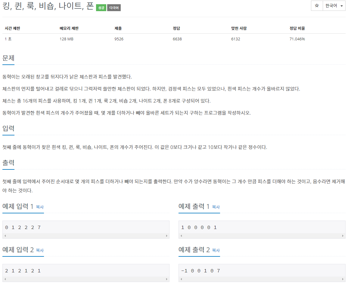 문제에 있는 킹, 퀸, 룩, 비숍, 나이트, 폰의 개수를 리스트에 저장해두고 입력을 다른 리스트에 받아 두 리스트의 차이값을 출력하면 되는 문제이다.