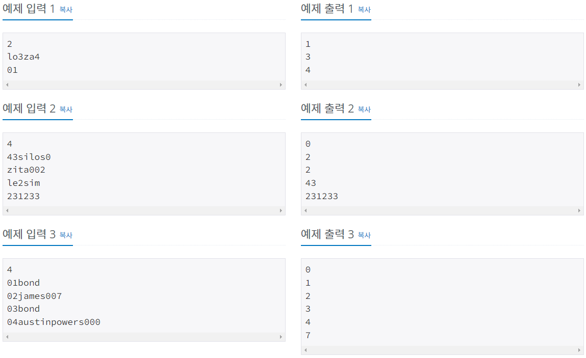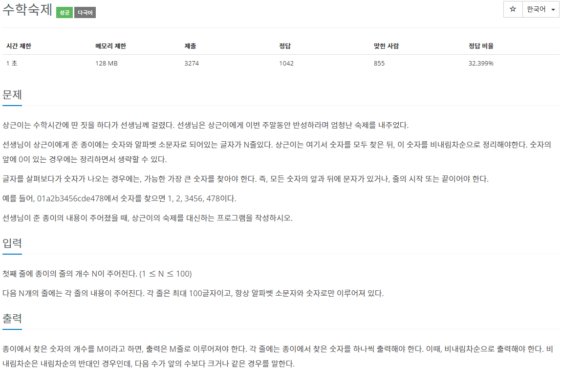 문자열에 대해서 숫자만 뽑아서 비 내림차순으로 출력(비 내림차순에 대해서는 문제 내용에 쓰여있다)