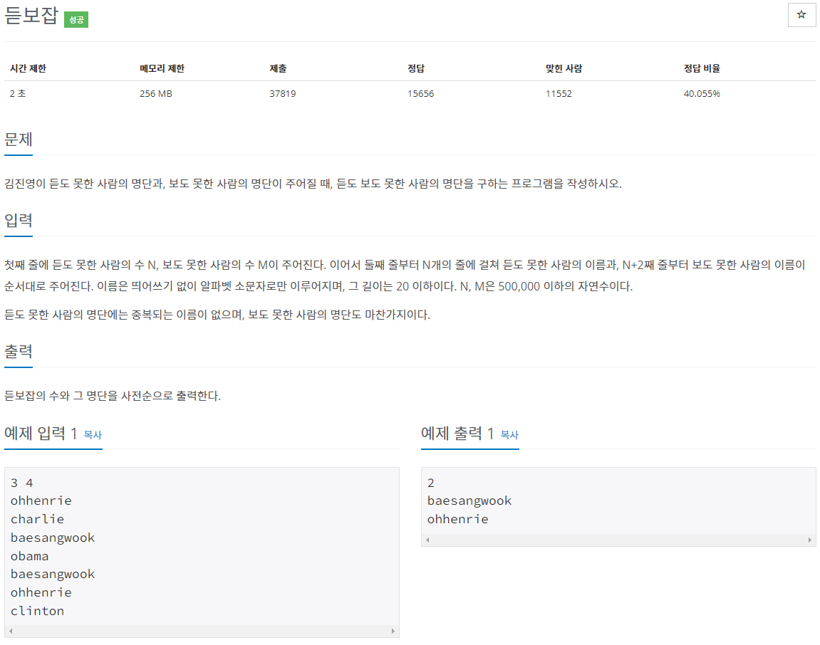 예제 입력1에서 듣도 보도 못한 사람들의 교집합에는 ohhennrie baesangwook 두 사람이 있기 때문에 출력의 결과가 이렇다.