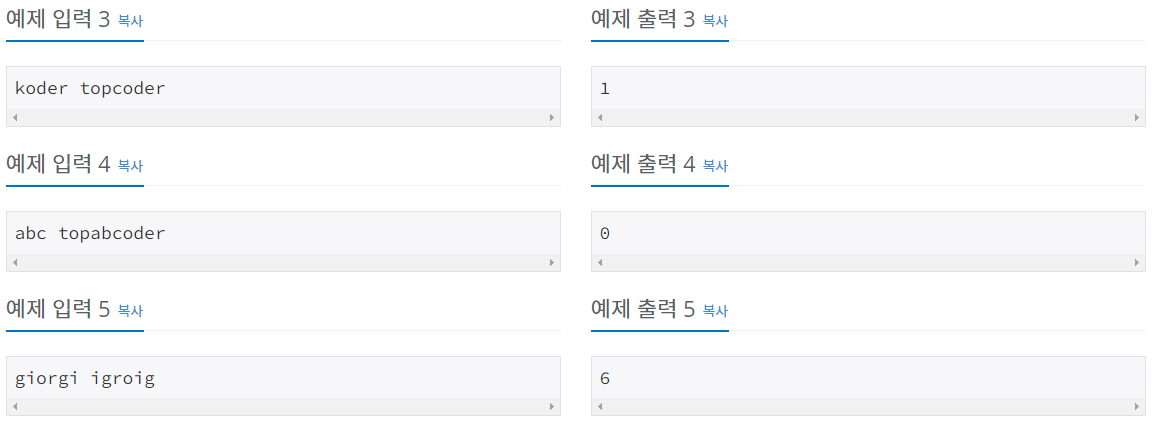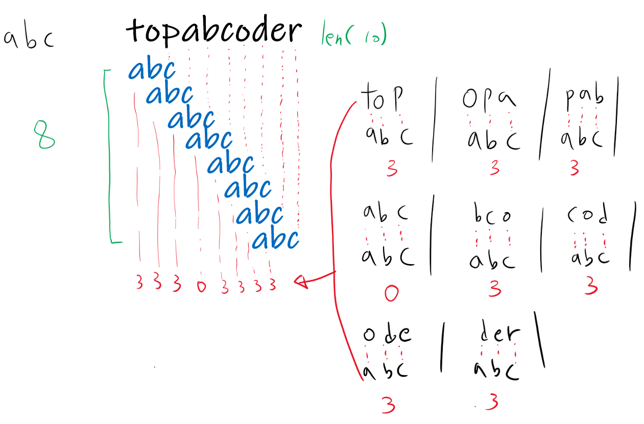 아래의 그림을 보면 A에 abc, B에 topabcoder가 들어왔을때 해당 B의 문자열을 abc로 비교할 수 있는 횟수는 총 8번이다. B의 문자열들을 인덱스 값을 하나씩 증가시켜가며 대조하는 것으로 보면 된다.