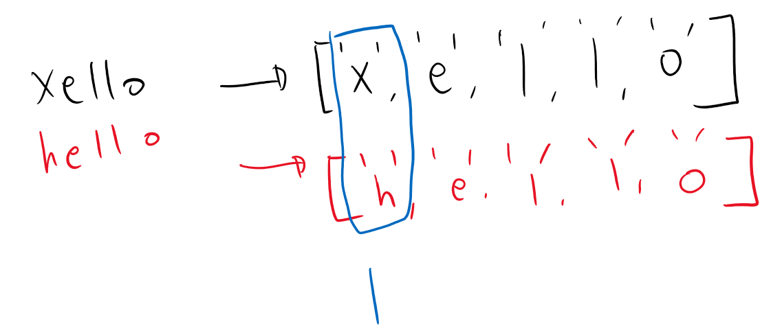아래의 그림을 보면 A에 hello, B에 xello가 들어왔을때 for문을 돌려 각각의 요소들이 같은지 다른지를 판별해 개수를 세서 리턴해주면 된다.