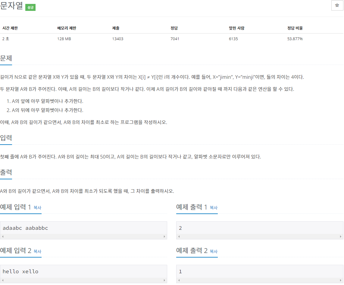A와 B의 길이가 같을 경우 B의 문자열 중에 A의 문자열 중에 어느 문자가 다른지를 판별해주어 개수를 세주면된다.