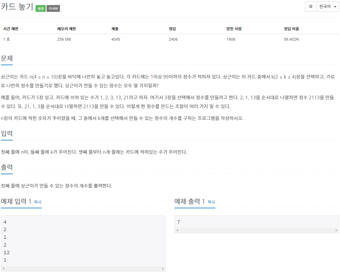 예제 1을 보면 첫째 줄에 카드의 총 개수(4장), 둘째 줄에 총 카드 중 몇 장(2장)을 뽑을지