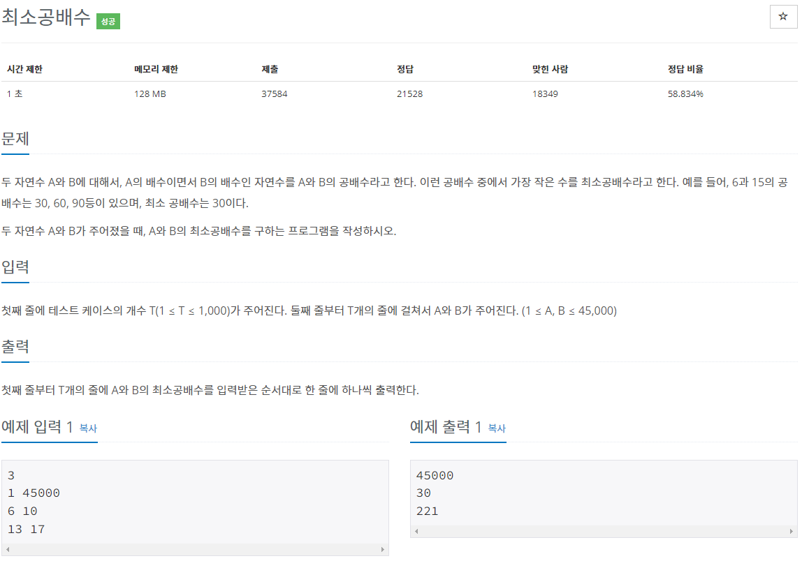 입력으로 들어온 두 수의 곱에서 두 수의 최대공약수로 나누면 그게 최소공배수이다.