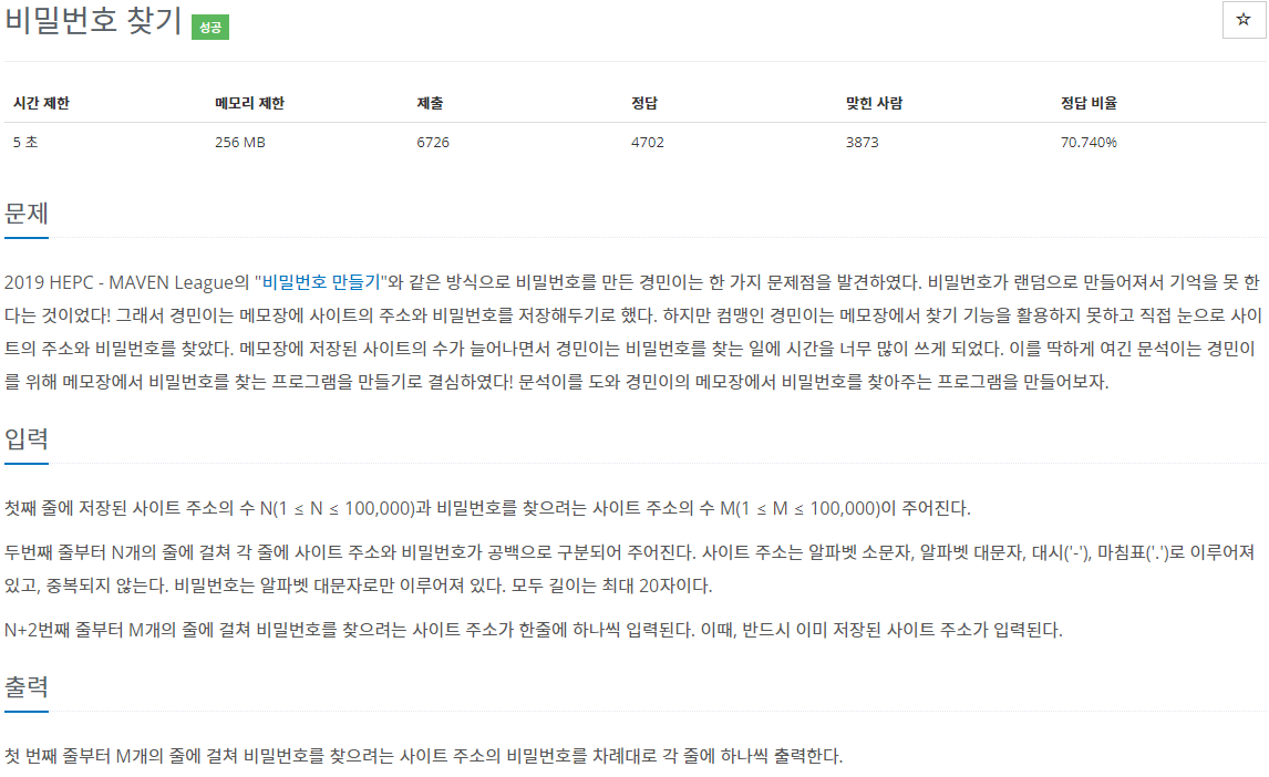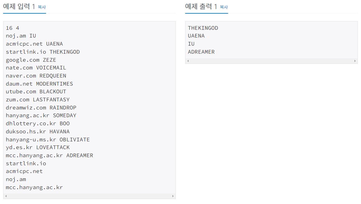 첫째 줄에 사이트 주소의 수와 비밀번호를 찾으려는 사이트 주소의 수가 공백을 두고 주어진다.