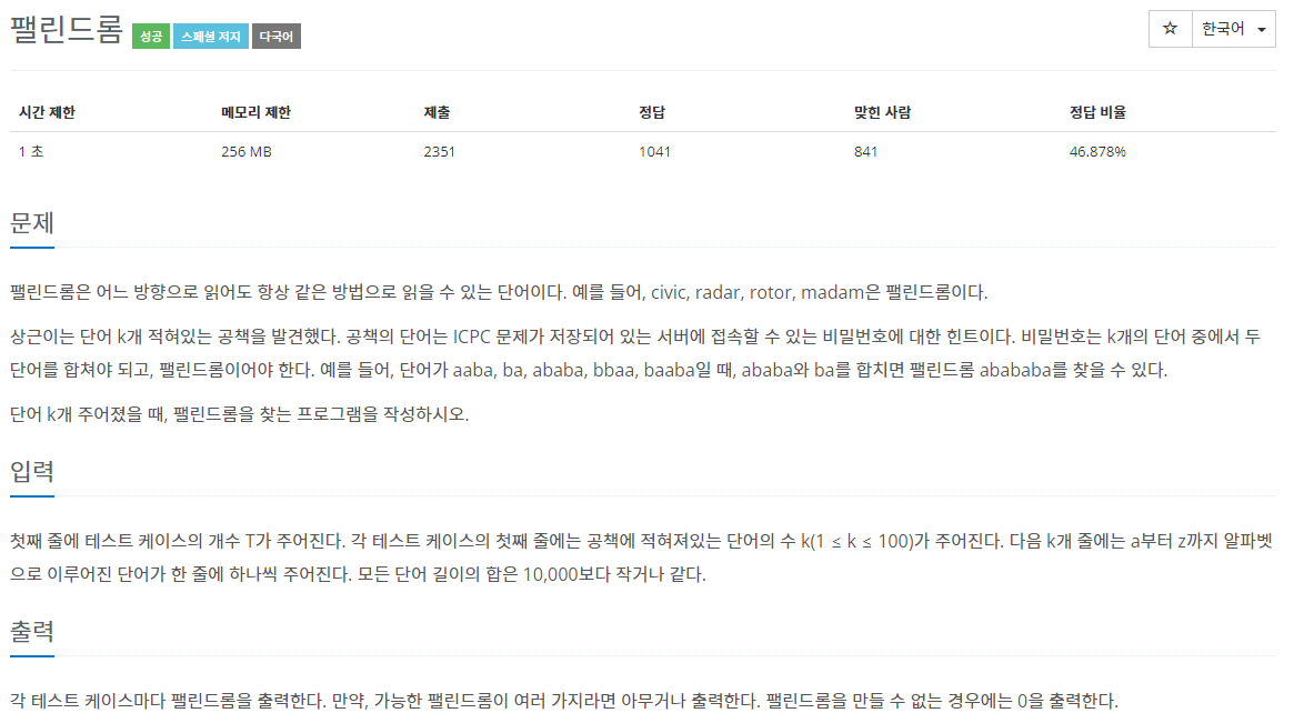 예제에 있던대로 팰린드롬이 한 개라면 예제 출력과 같이 한 개만 나오겠지만 팰린드롬이 여러 가지라면 그중 하나만 출력해야 되는 걸 생각하지 못해서 삽질을 꽤 많이 했다.