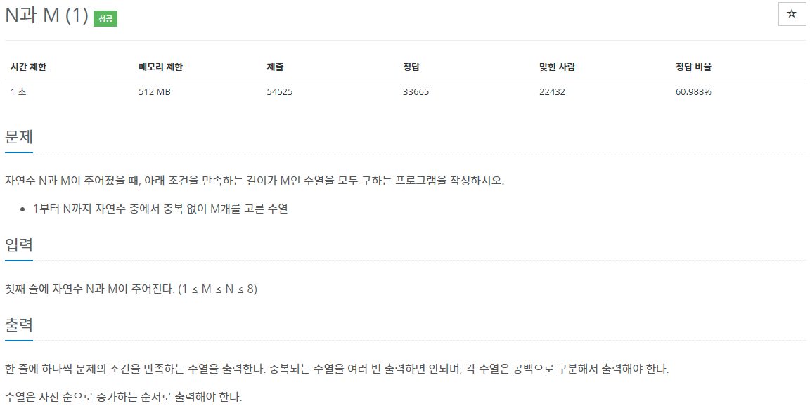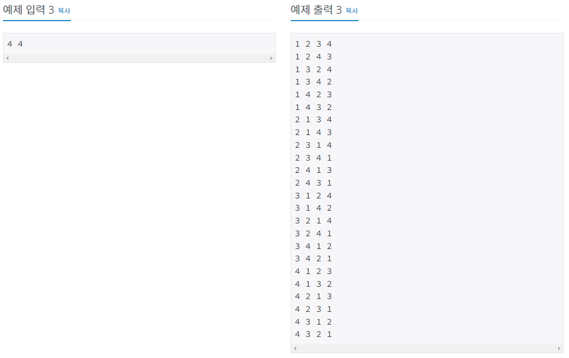 - 1부터 N까지 자연수 중에서 중복 없이 M개를 고른 수열