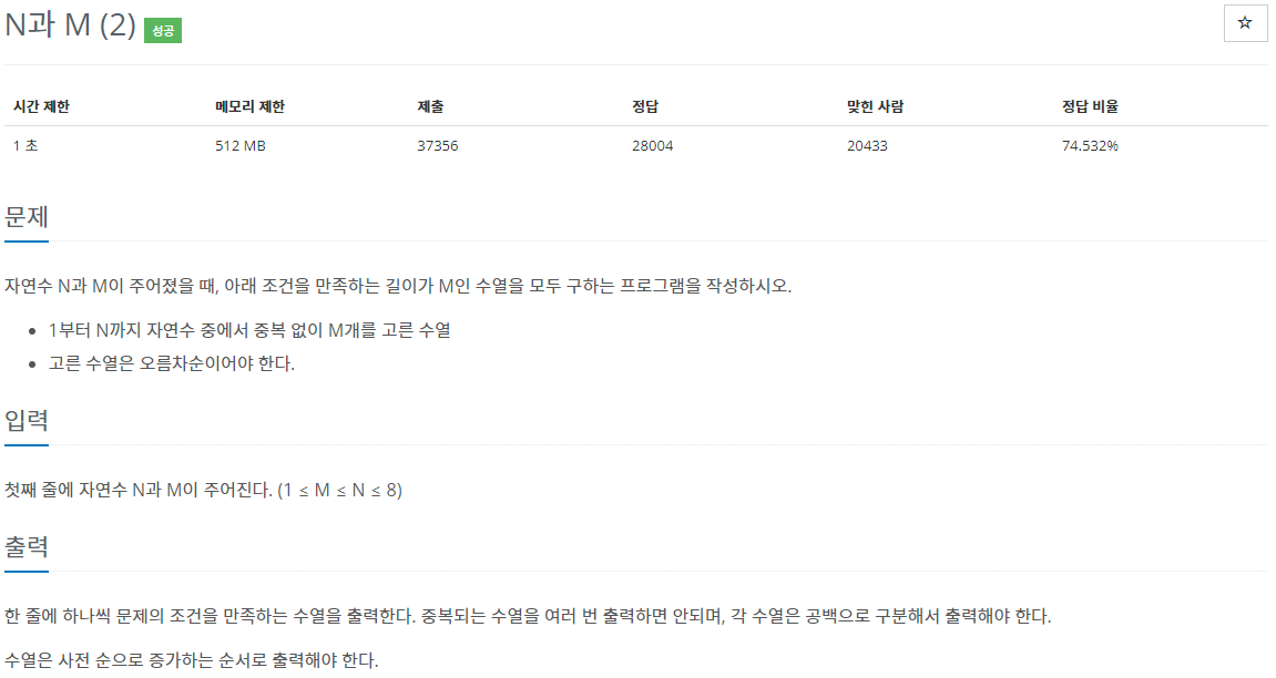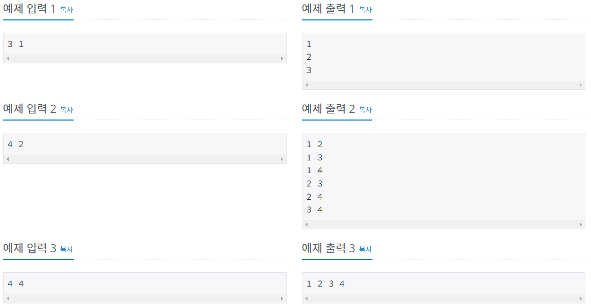 문제 풀이 N과 M의 입력이 주어지는데 N과 M의 조건은 아래와 같다. 1부터 N까지 자연수 중에서 중복 없이 M개를 고른 수열 쉽게 말해 N에 4, M에 2가 들어왔을 경우 1, 2, 3, 4 중에 2개를 고르면 아래
