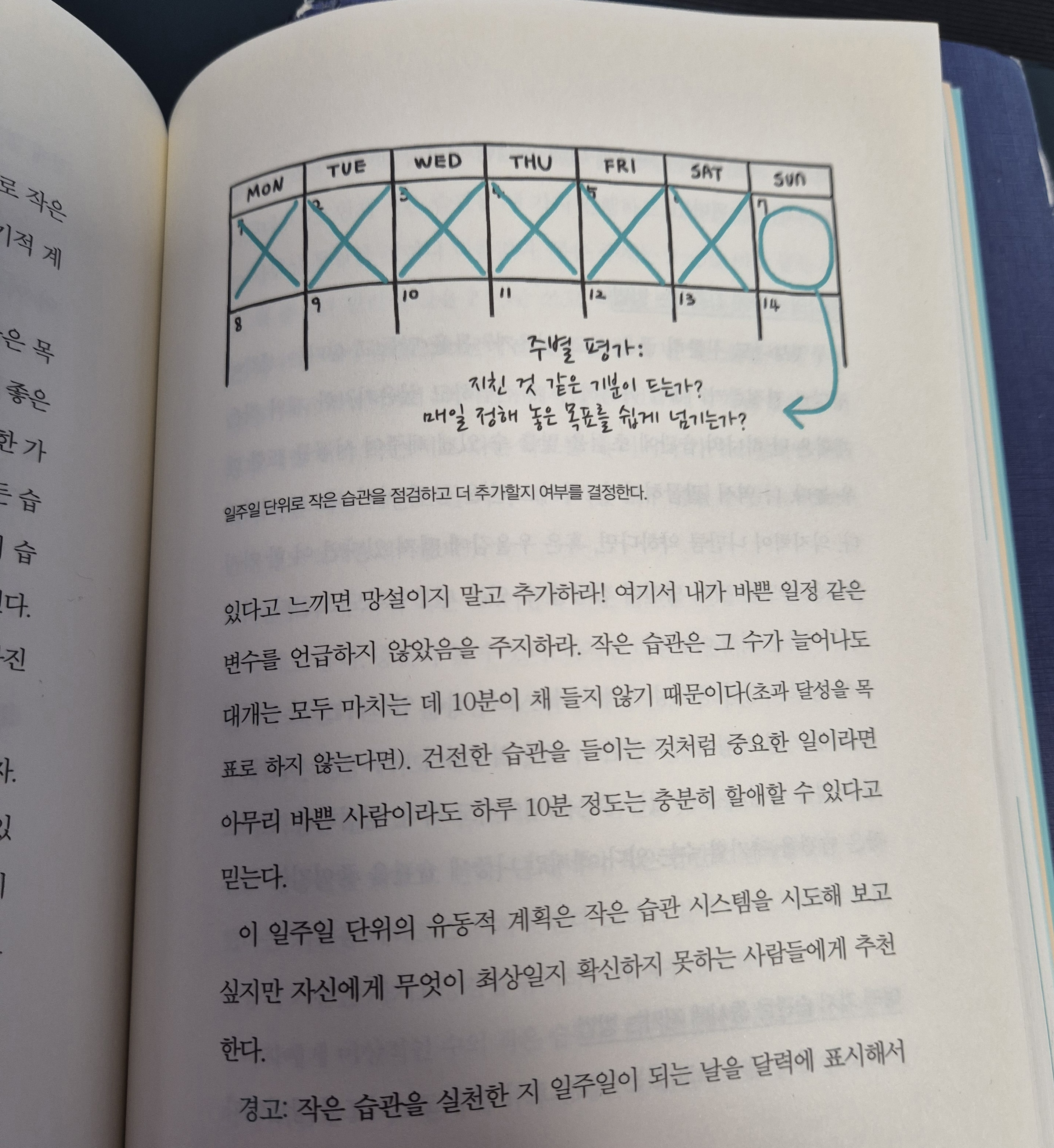 "습관의 재발견"의 저자는 작은 습관을 위한 세운 목표를 꾸준히 하는 것도 좋지만 주별 평가를 하라고 추천했다.