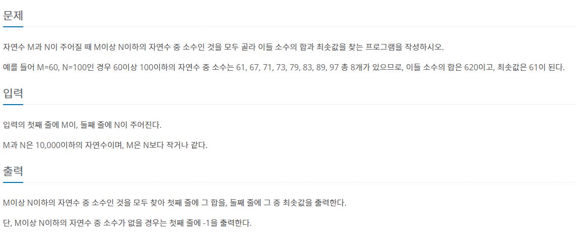 1. M이상 N이하의 자연수 중 소수인 것을 모두 찾아 첫째 줄에 합