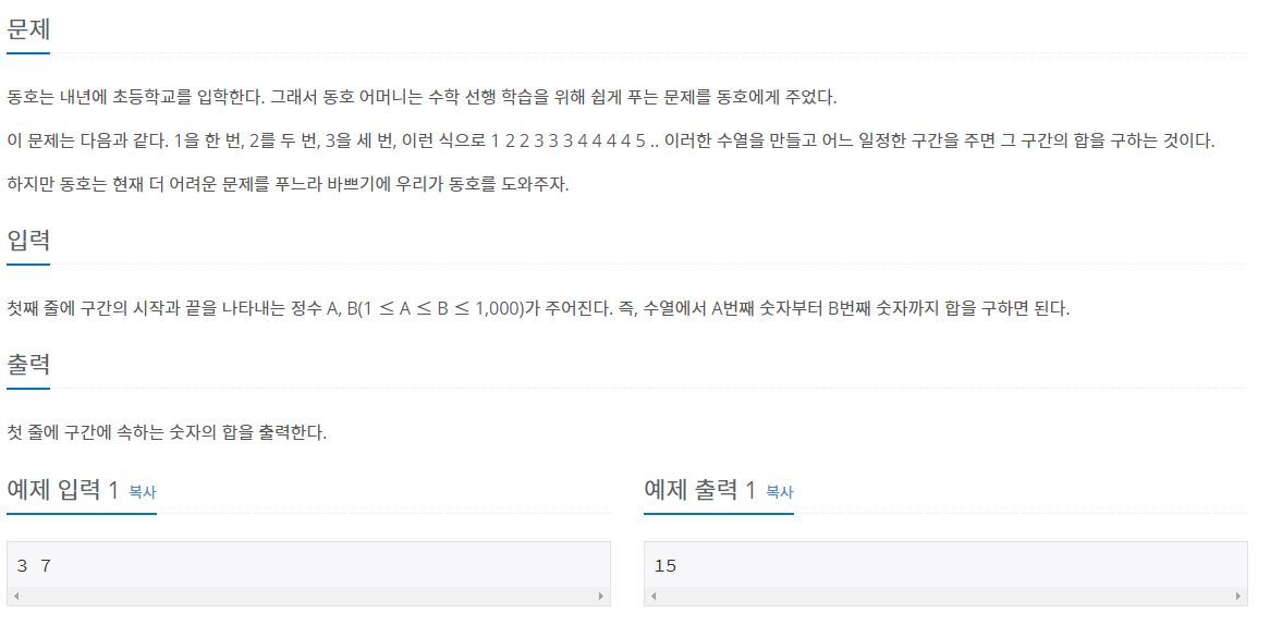 예제 입력 1에 보면 3, 7을 입력으로 받아서 15가 출력되었는데