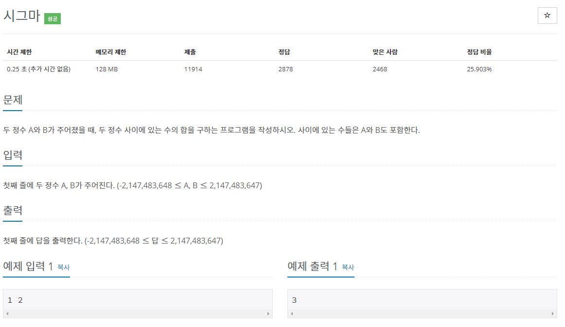 import java.util.Scanner; public class Main { public static void main(String[] args) { Scanner sc = new Scanner(System.in); long A = sc.nextLong(); long B = sc.nextLong(); System.out.println(recur(A, B)); } public static Long recur(long A, long B){ if(A>B){ return recur(A-1, B)+A; }else if(A<B){ return recur(A, B-1)+B; }else{ return A; } } } - 그래서 내 코드가 문제인 것 같아서 검색을 해봤다. '가우스 덧셈'