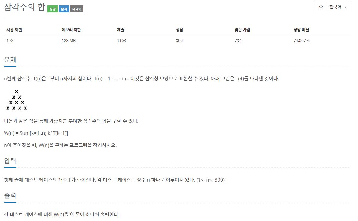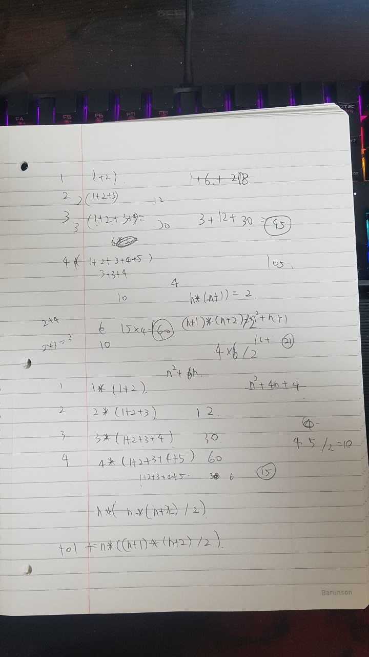 그래서 나온 식은 n x ( (n+1) x (n+2) ) / 2 이고 누적을 시켜주면 된다. 이 공식을 구하기 위해서 거꾸로 풀었다.