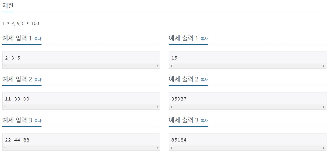 // 제한 조건 1 ≤ A, B, C ≤ 100