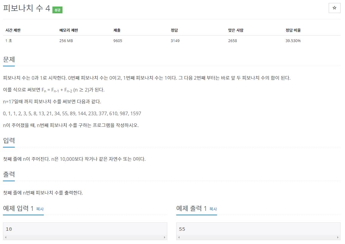 먼저 문제를 보기 전 어제 풀었던 피보나치 수 문제와 같은 문제다. 단지 범위가 커진 것 뿐... [java] 백준 2747번 피보나치 수 문제를 설명하기 앞서 이 아래의 문제와 같은 문제이다. 예제 입력과
