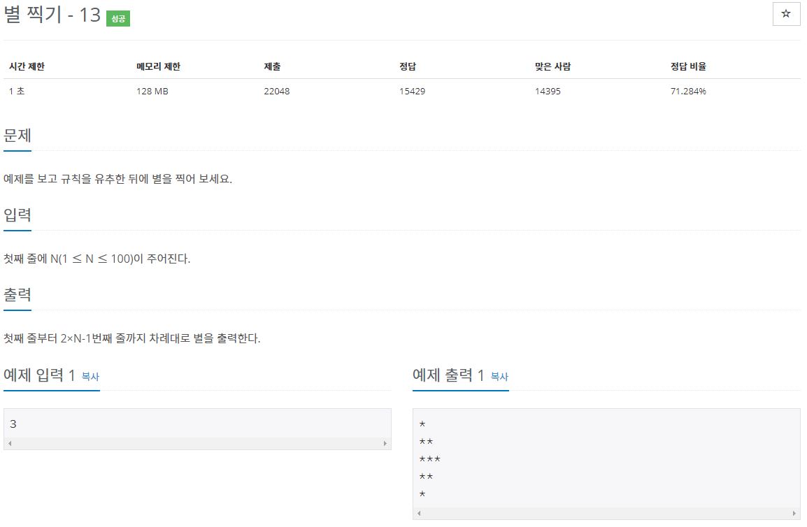 첫째 줄부터 2×N-1번째 줄까지 차례대로 별을 출력한다.
